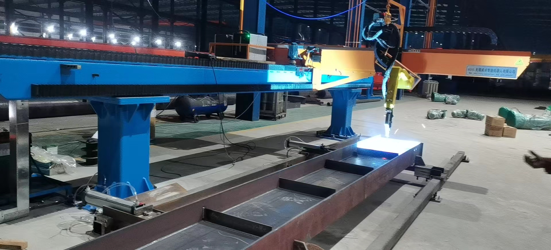 智能焊接在鋼構(gòu)行業(yè)的成功應(yīng)用針對(duì)鋼結(jié)構(gòu)中常見的H型鋼等鋼梁工件,威卓設(shè)計(jì)研發(fā)了小龍門智能焊接工作站,焊槍部分使用鋼梁專用焊槍,更適用于鋼梁焊接;搭配傳感器使用,自動(dòng)尋位識(shí)別焊縫,無(wú)